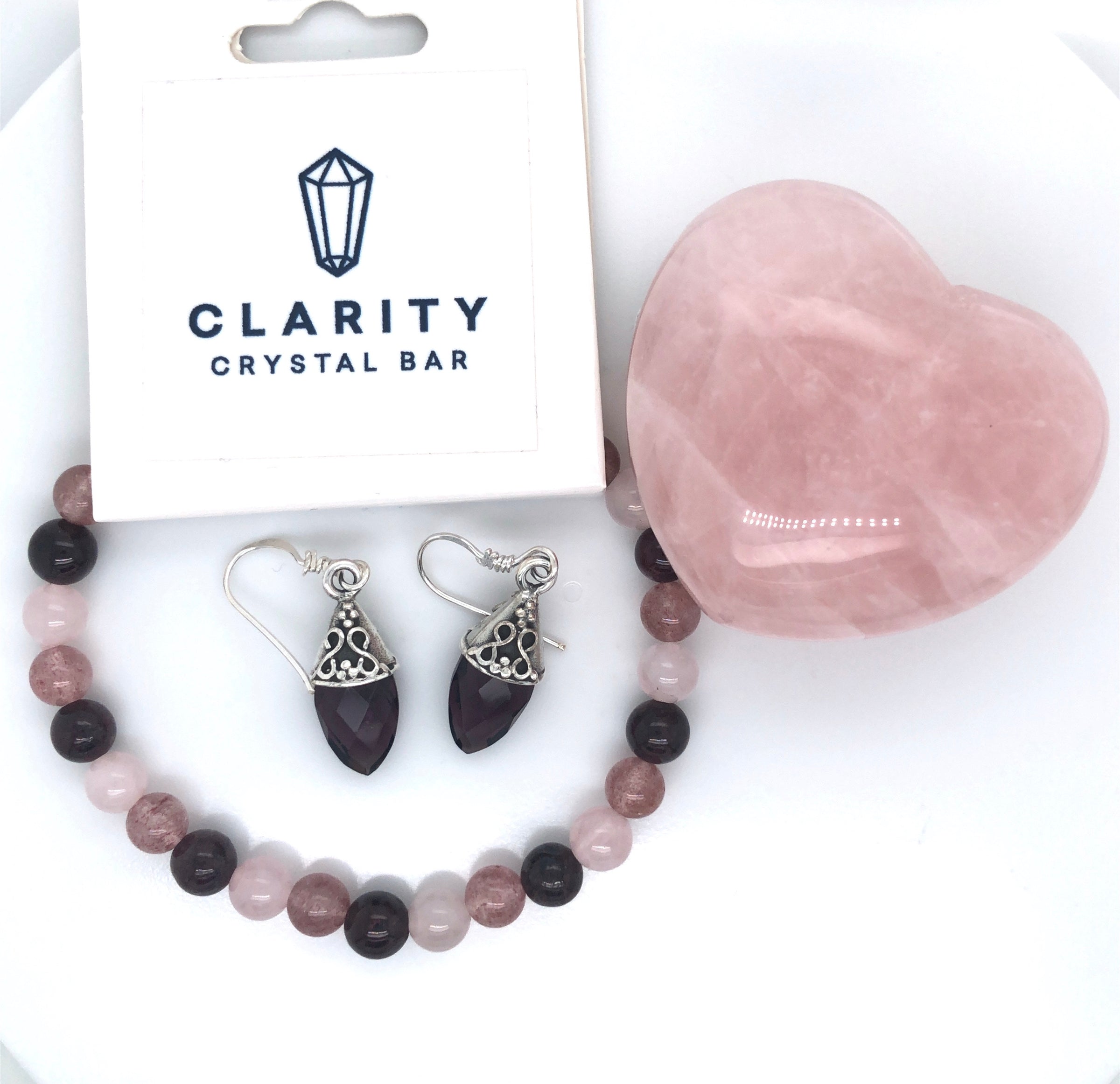It features 3 stunning pieces, including a 1.5" Rose Quartz Heart crystal, a 6mm Rose Quartz, Strawberry Quartz and Garnet Stretch Bracelet, and absolutely STUNNING Amethyst Faceted Drop Earrings. Don't miss this gorgeous set!