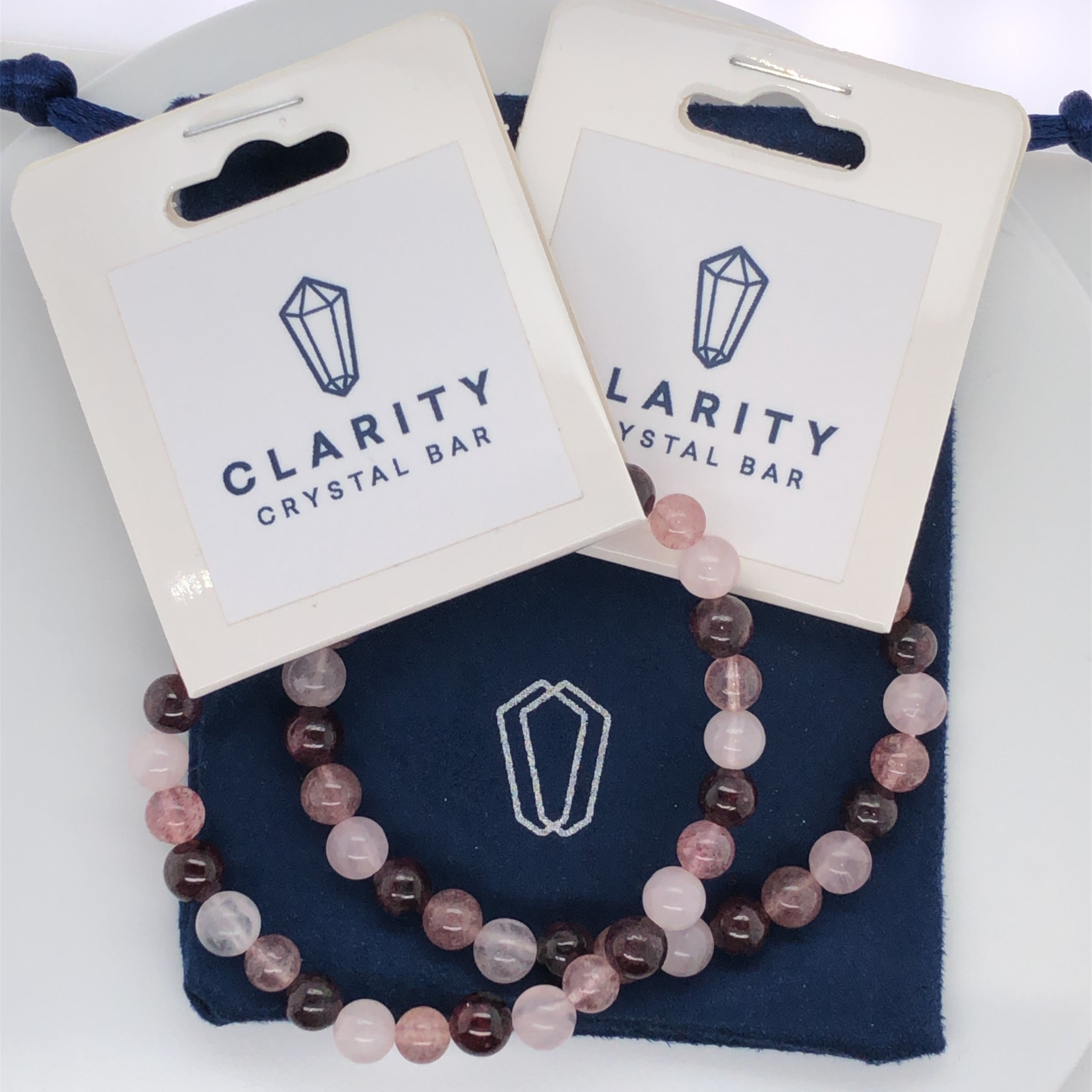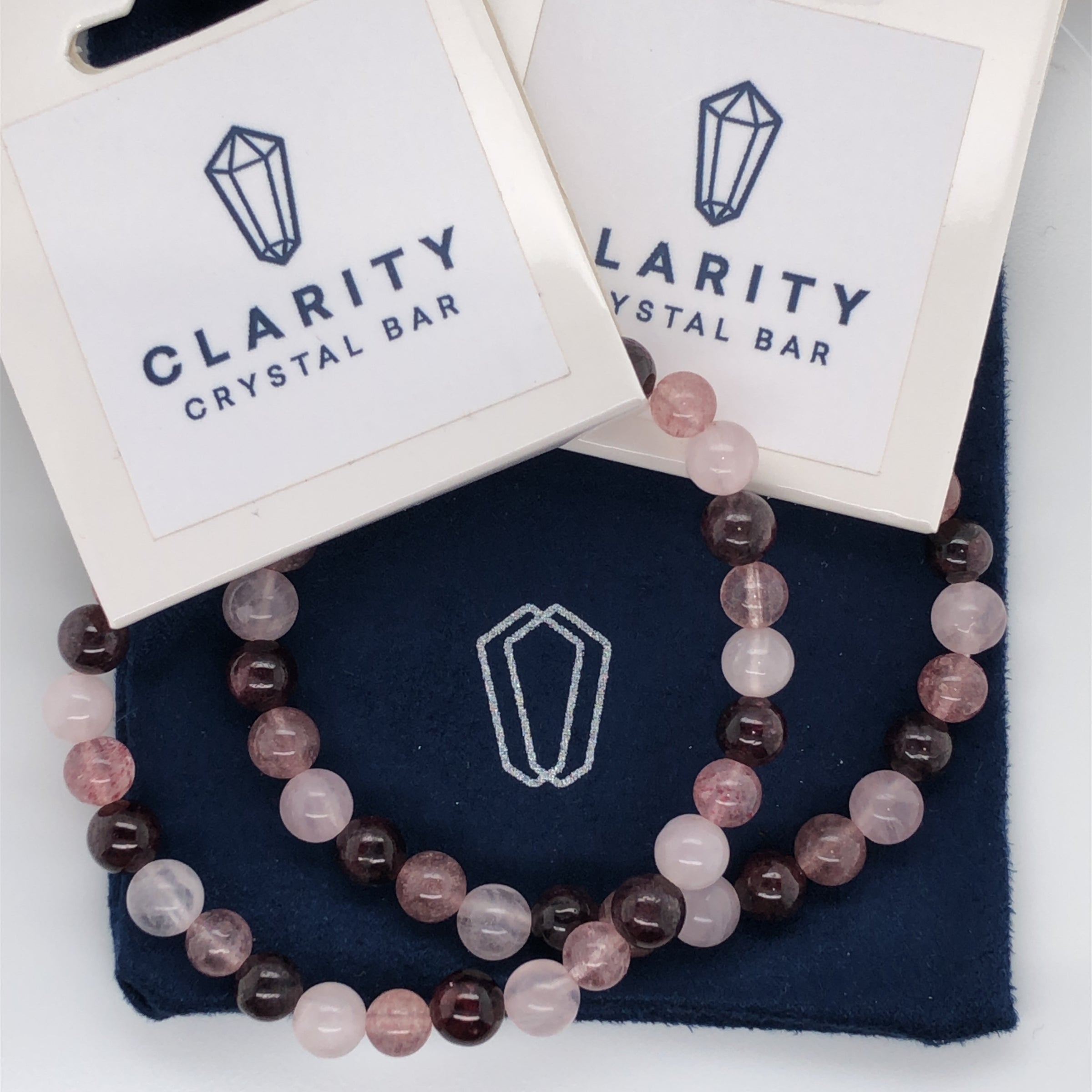 These mesmerizing Rose Quartz, Strawberry Quartz and Garnet crystal bracelets are perfect for stacking or wearing on their own. They are stunning to look at and are great for giving away to a friend or loved one. Don't miss these and others in our Clarity Crystal Bar